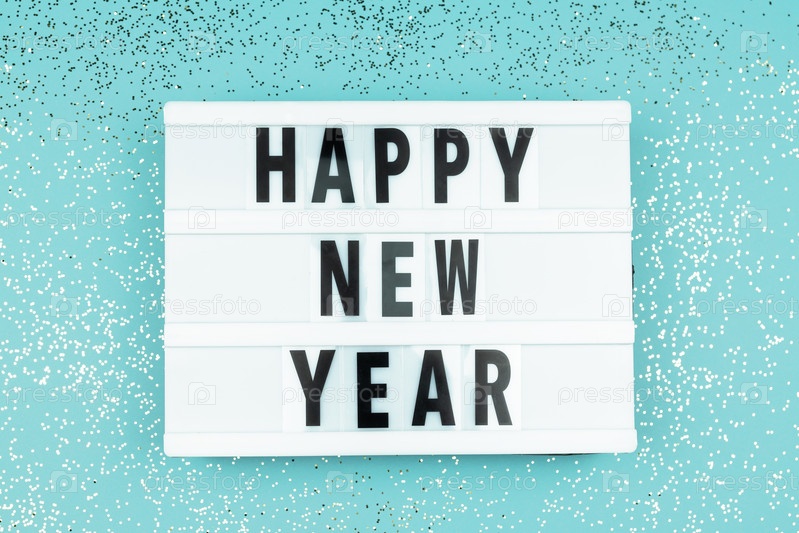 Световой короб с новым годом на синем фоне с разбросанными сверкающими конфетти