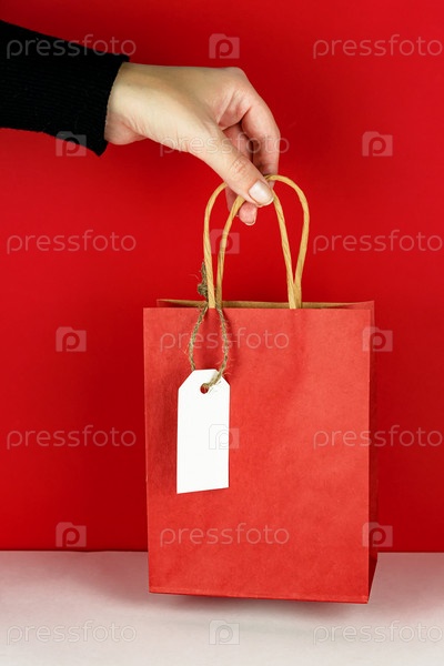 Женская рука держит красный бумажный пакет для покупок на красном фоне. Черная пятница монохромная концепция. Макет