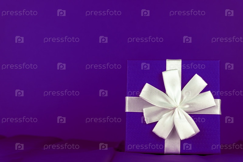 Открытка для празднования бонохромного фиолетового, подарочная коробка с завязанным белым бантом на фиолетовом фоне с копировальным пространством