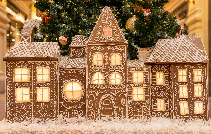 Дом из искусственного имбирного хлеба с включенным светом. украшение интерьера к новогодним и рождественским праздникам
