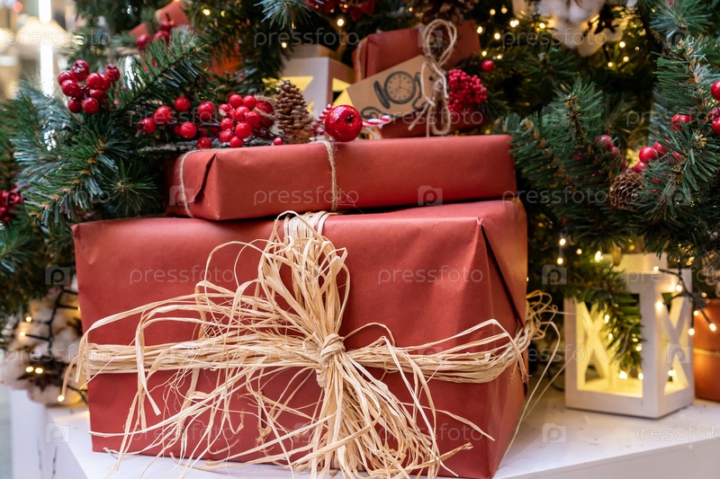 Рождественские и новогодние праздники фон. Рождественская елка с гирляндой и лежащими подарочными коробками с бантом
