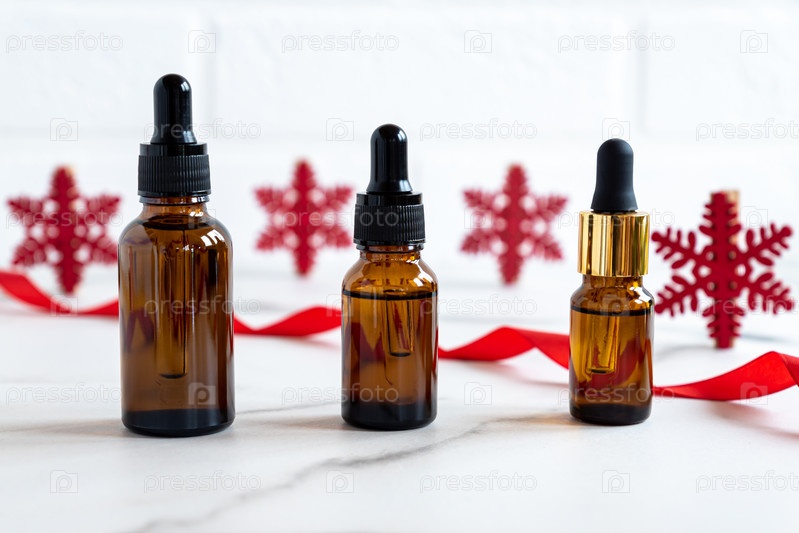 Эфирное масло или сыворотка в косметической бутылке на мраморном столе с рождественским декором. Косметика, уход за кожей зимой. Бутылка ароматизированного масла