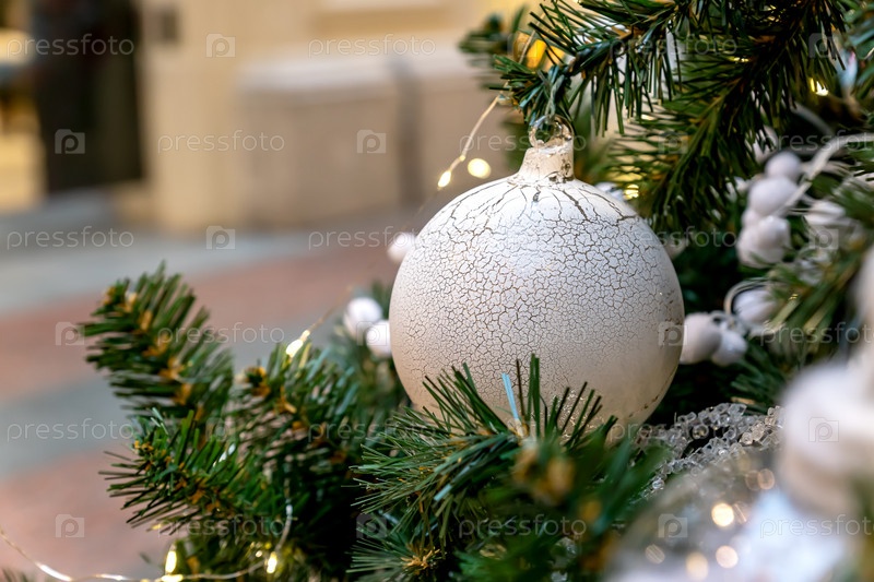 Закройте украшение елки игрушками и гирляндами. Праздничная открытка к зимним праздникам