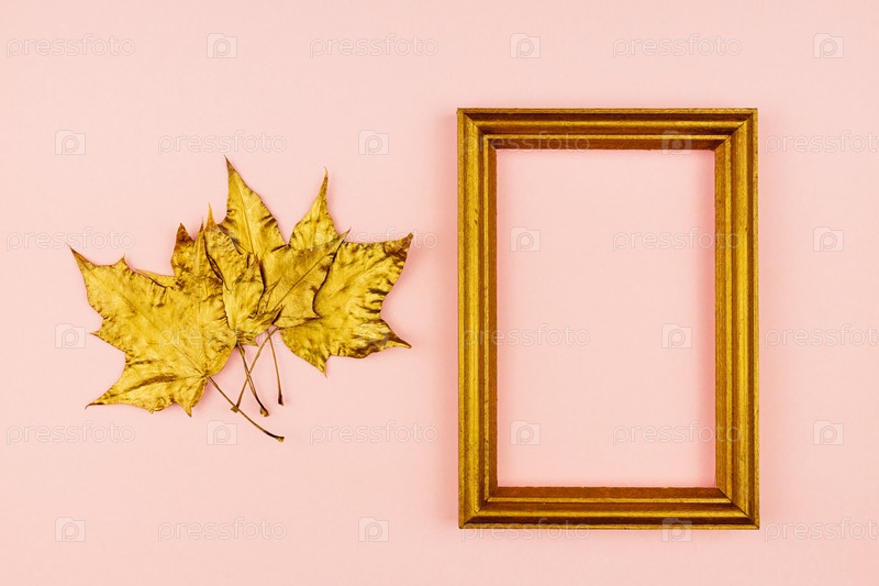 Осенний букет из золотых окрашенных кленовых листьев на розовом фоне. Модная концепция. Flay лежал в стиле минимализма