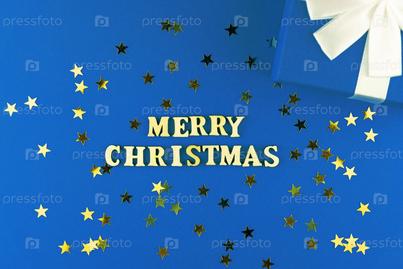 Деревянные буквы на синем фоне. С рождеством надпись на синей бумаге с разбросанными звездами конфетти и подарочной коробкой