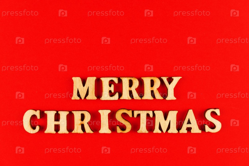 Деревянные буквы на красном фоне. Счастливого Рождества надписи в красной бумаге. Копировать пространство