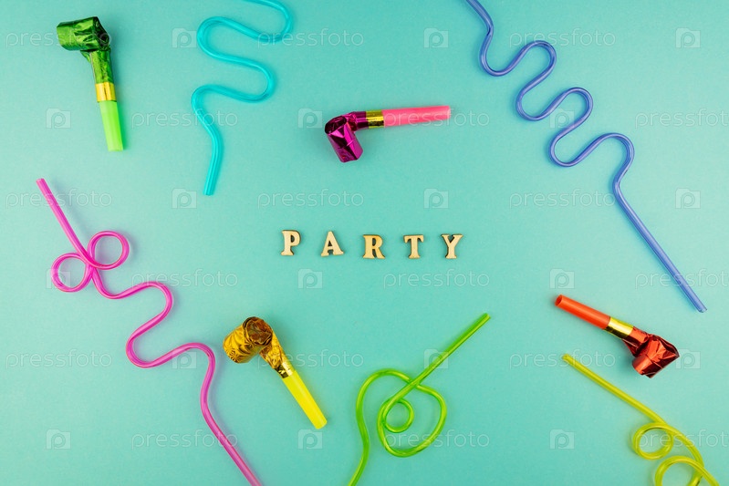 Яркий фон праздничной вечеринки - коктейльные соломинки и свистки для вечеринок на синем фоне