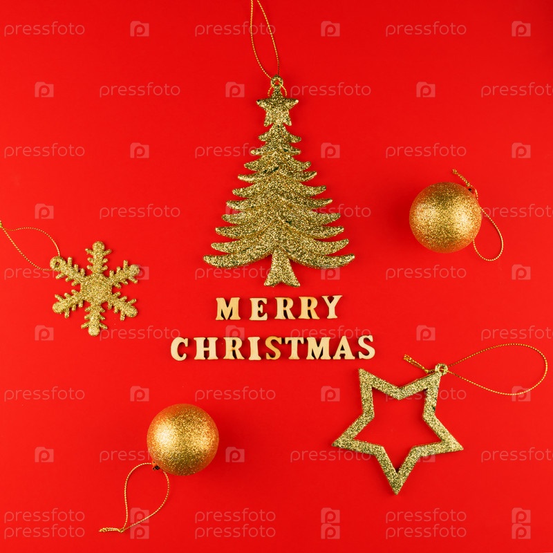 Праздничная открытка. С рождеством надпись на красной бумаге с золотыми блестящими игрушками