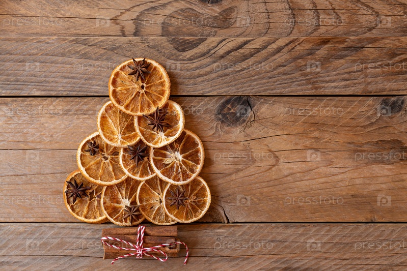 Альтернативная новогодняя елка. Вид сверху на рождественскую елку из анисовой звезды, палочек корицы, сухого апельсина на деревянном фоне. Скопируйте пространство, плоская планировка. Минимальная концепция