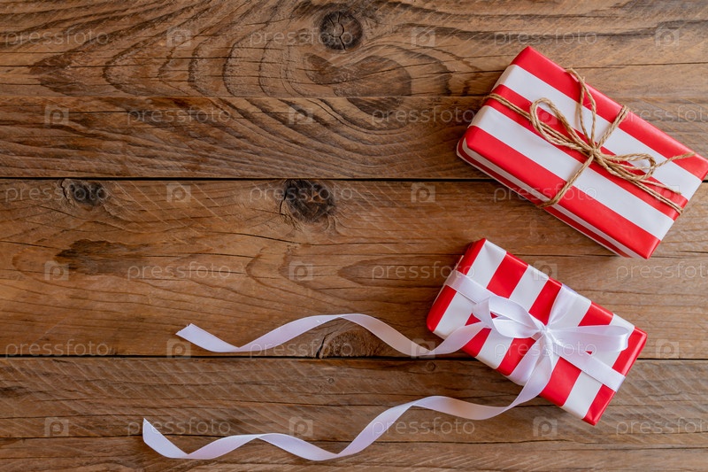 Две красные и белые полосатые подарочные коробки на деревянном фоне с копией пространства. Праздничная открытка на рождество и новый год
