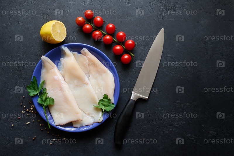 Свежий кальмар из морепродуктов на тарелке крупным планом и нож шеф-повара, приготовление пищи, горизонтальное, плоское положение с копией пространства