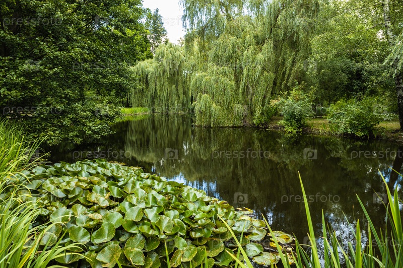 Живописный вид на городской парк с зелеными деревьями и прудом