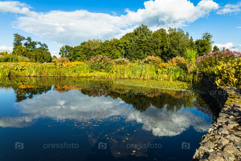 Зеленая лужайка в городском парке с болотом при дневном свете
