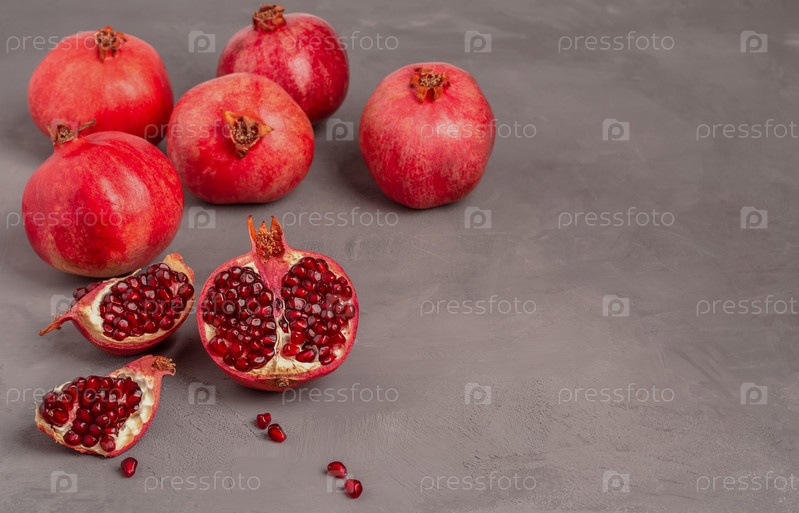 Спелые свежие гранаты на бетонной поверхности. Копировать пространство