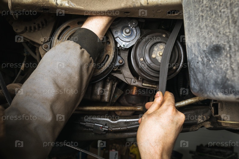 Автомеханик устанавливает ремень генератора в двигатель легкового автомобиля