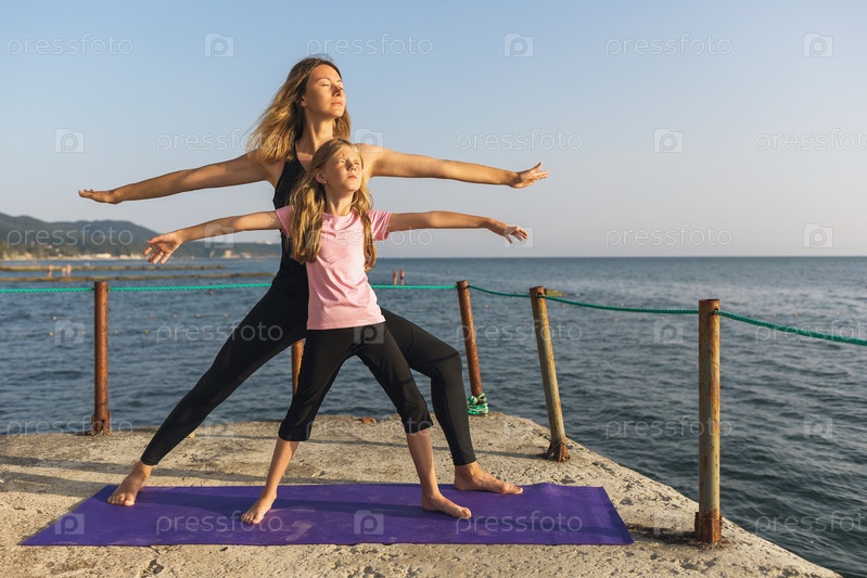 Мама и дочь занимаются йогой, солнечным летним вечером на пирсе у моря, стоя на коврике, выполняют упражнение вирабхадрасана, поза воина