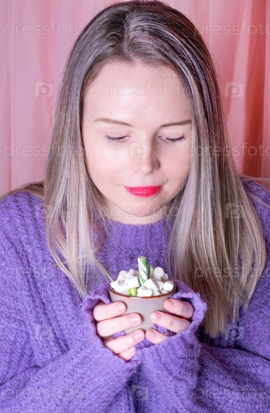 Молодая женщина в фиолетовом свитере держит кружку горячего шоколада с зефиром. Согревающий напиток в холодный день