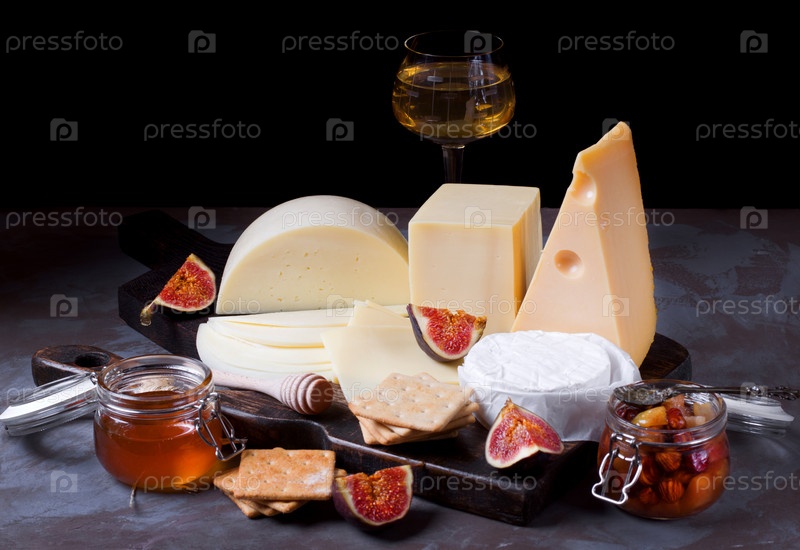 Сырная доска с бри, маасдамом, гаудой и козьим сыром, инжиром, медом и джемом. Ассортимент закусок на сером столе
