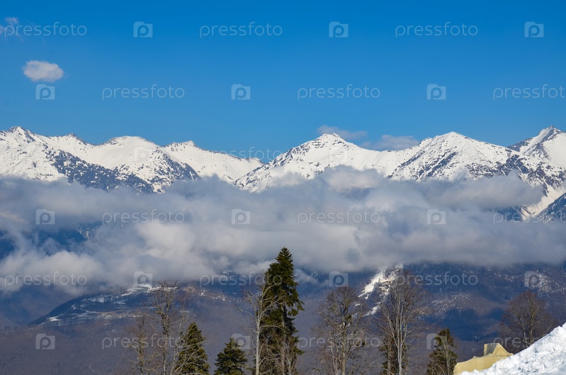 Снежный зимний пейзаж горнолыжного курорта. Панорамный вид