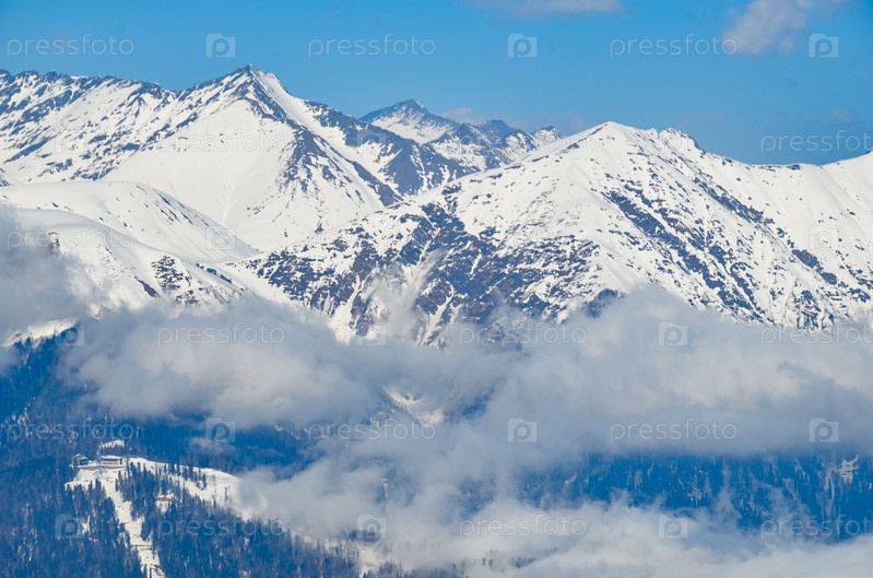 Снежный зимний пейзаж горнолыжного курорта. Панорамный вид