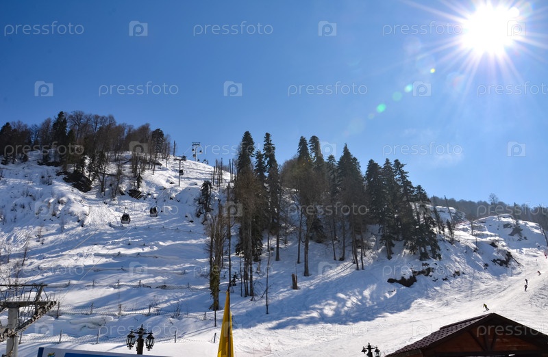 Снежный зимний пейзаж горнолыжного курорта. Панорамный вид