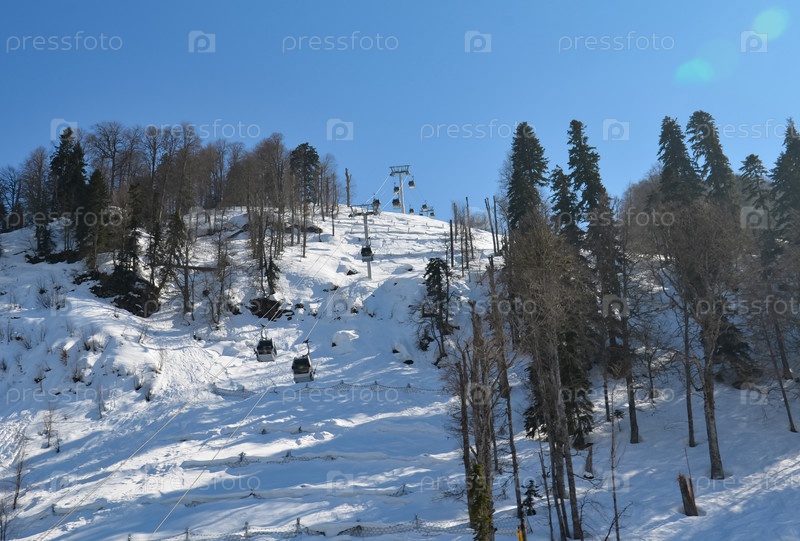 Снежный зимний пейзаж горнолыжного курорта. Панорамный вид