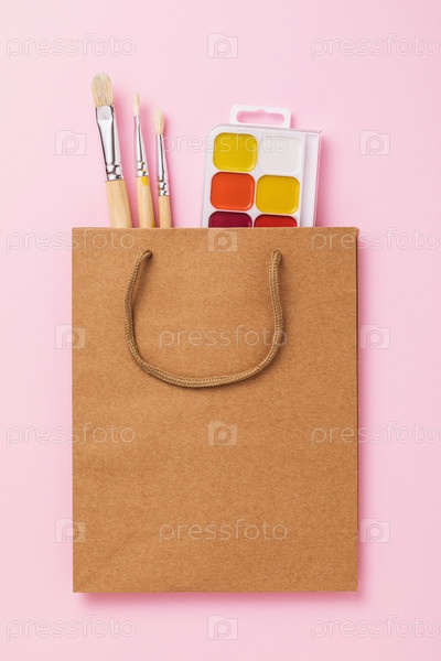Кисти и акварельные краски в бумажном пакете на розовом фоне, вид сверху