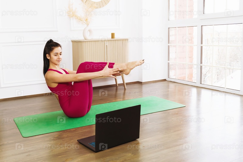 Молодая женщина в спортивной одежде занимается йогой, занимается дома с онлайн-тренером, делает позу лодки, Парипурна Навасана. Концепция на тему онлайн-обучения