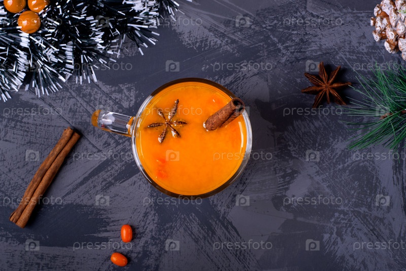Чай из облепихи с корицей, анисом и имбирем в стеклянной кружке на сером столе. Горячий напиток, полный витамина С, укрепляющий иммунную систему. Вид сверху