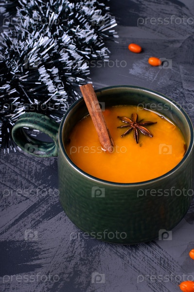 Облепиховый чай с корицей, анисом и имбирем в зеленой кружке. Горячий напиток с облепихой, полный витамина С, укрепляющего иммунную систему