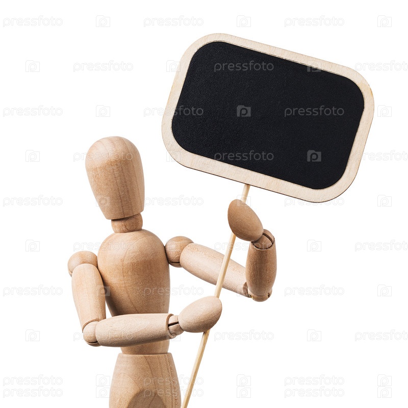 Деревянный человек держит табличку для надписей, изолированных на белом фоне. Шаблон на тему демонстраций или протестов. Монекен защищает свои интересы