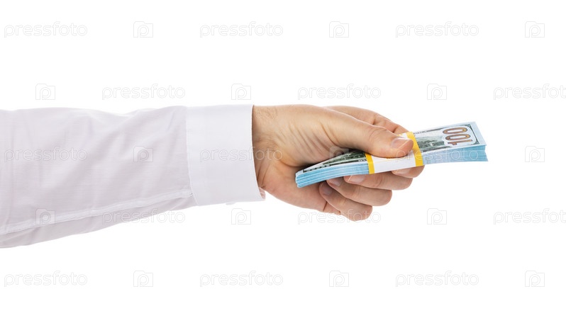 Мужчина дает стодолларовую пачку денег, изолированную на белом фоне, шаблон для дизайнера
