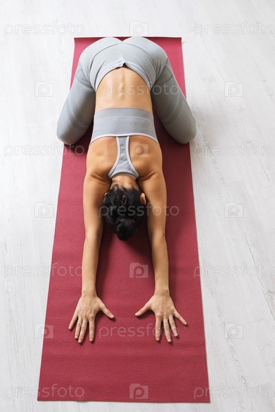 Привлекательная спортивная женщина, выполняющая упражнения на баласану с неглубоким открытием бедра, поза ребенка, тренирующаяся на коврике в комнате в спортивной одежде