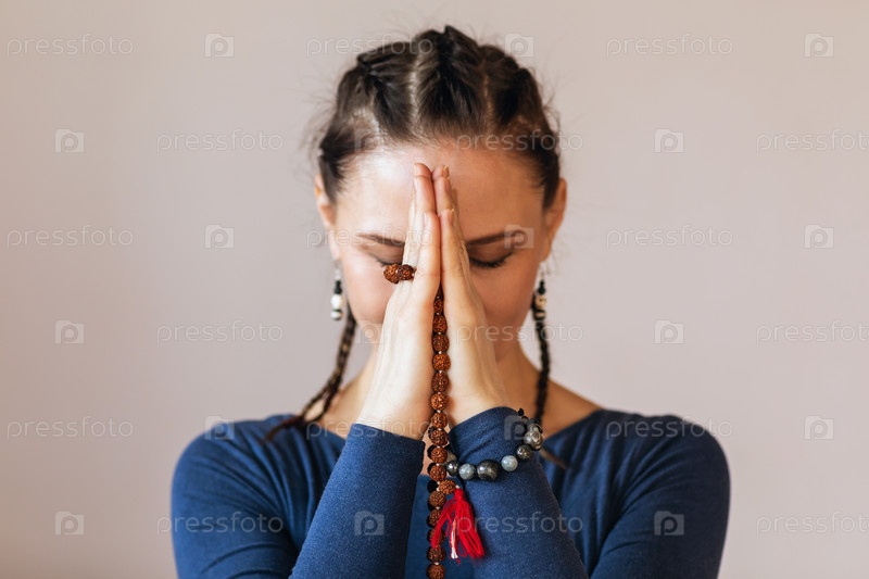 Женщина, практикующая йогу, выполняет медитацию с намасте возле лица, держа в руках четки, крупным планом