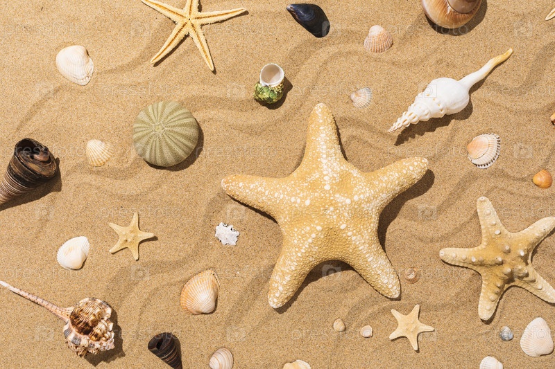 Коллекция различных ракушек и морских звезд на песке в солнечный день