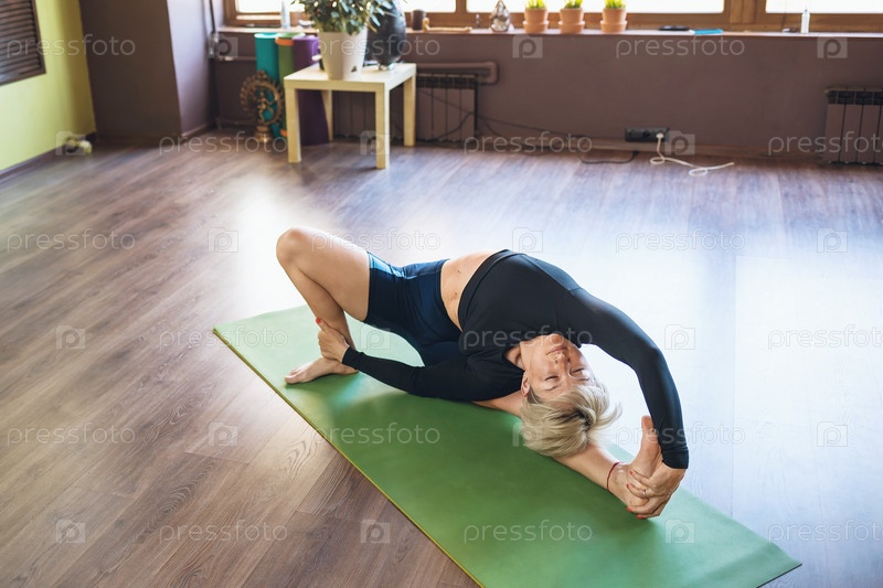 Женщина, ведущая здоровый образ жизни и практикующая йогу, выполняет упражнения паривритта джана ширшасана, наклон головы до колен, тренируется одна в спортивной одежде, лежа на коврике в студии