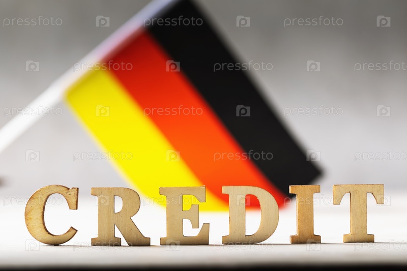 Текст деревянных букв и немецкий флаг на абстрактном фоне, концепция кредита из Германии