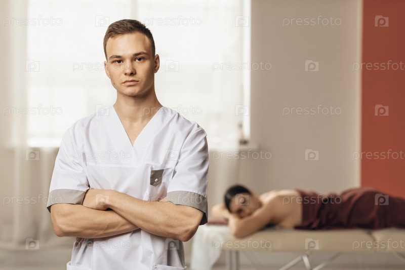 Портрет молодого массажиста, позирующего в своем кабинете