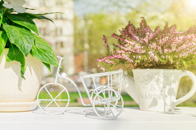 Белый керамический цветочный горшок в форме лейки на полке на открытом воздухе, в саду или в интерьере