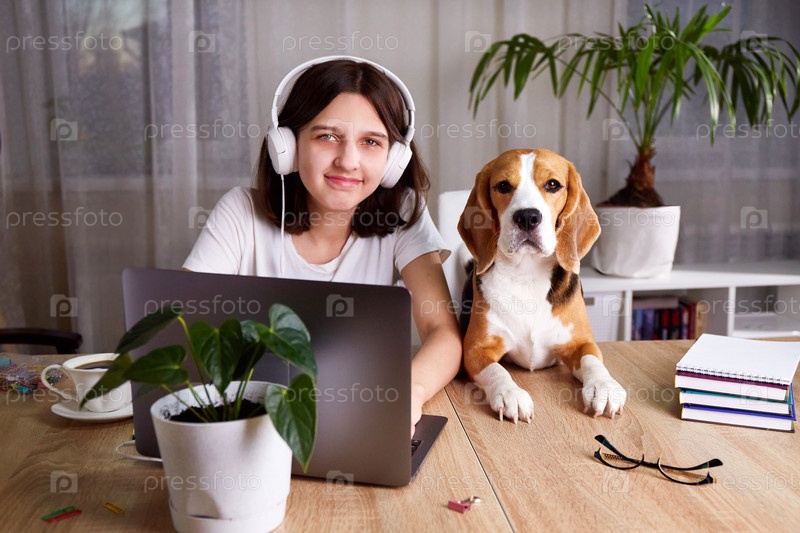 Молодая девочка-подросток в наушниках сидит со своей собакой-биглем за столом перед ноутбуком