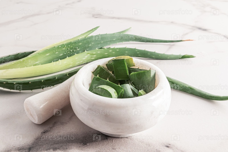 Белая мраморная ступка с пестиком с нарезанными ломтиками алоэ вера на мраморном фоне рядом со свежими листьями растения. мраморный фон