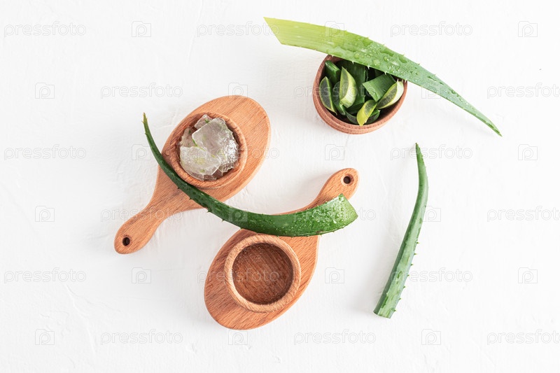 Две деревянные миски с натуральным гелем алоэ вера и кусочками свежего сочного растения на деревянных досках, вид сверху. белый текстурированный фон