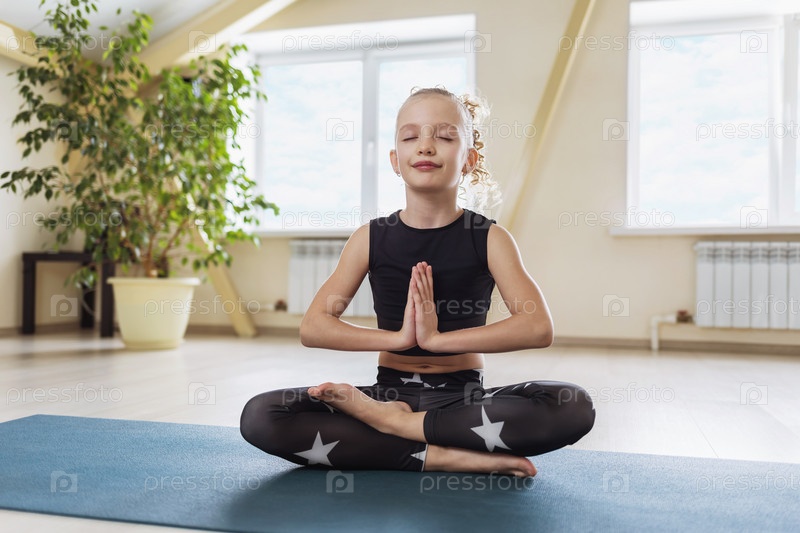 Маленькая девочка в черной спортивной одежде, занимающаяся йогой, занимается медитацией, сидя в позе лотоса, показывая руками приветствие намасте в комнате. Концепция детской йоги