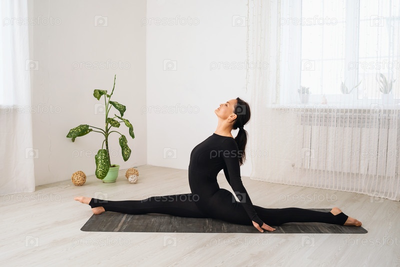 Женщина в черной спортивной одежде, практикующая йогу, выполняет упражнение Ханумасана, продольный шпагат, сидя на коврике в комнате у окна