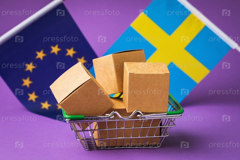 Картонные коробки в продуктовой корзине и флаги на цветном фоне, концепция распределения шведских товаров в Европейском Союзе