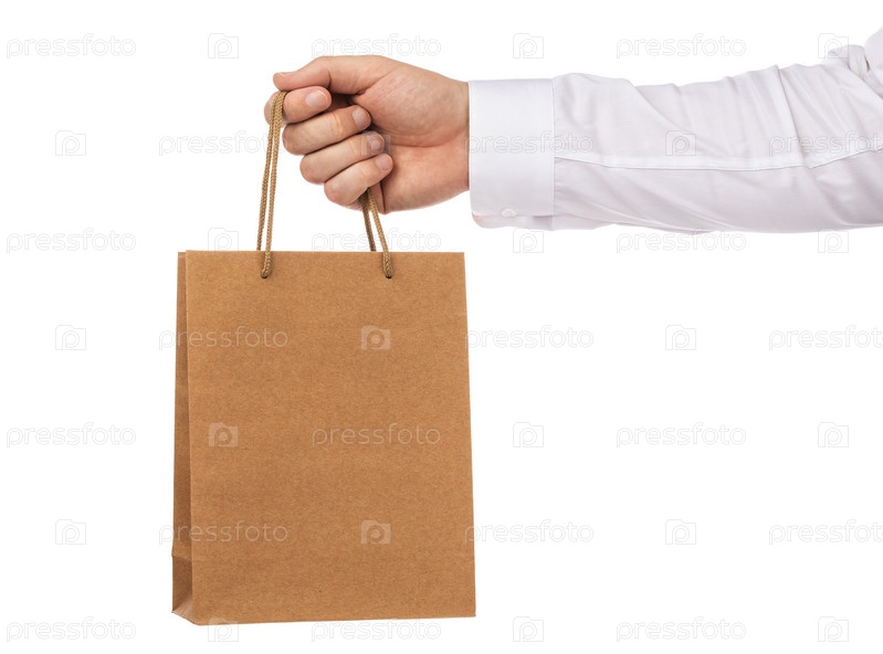 Бумажный пакет в руке на белом фоне
