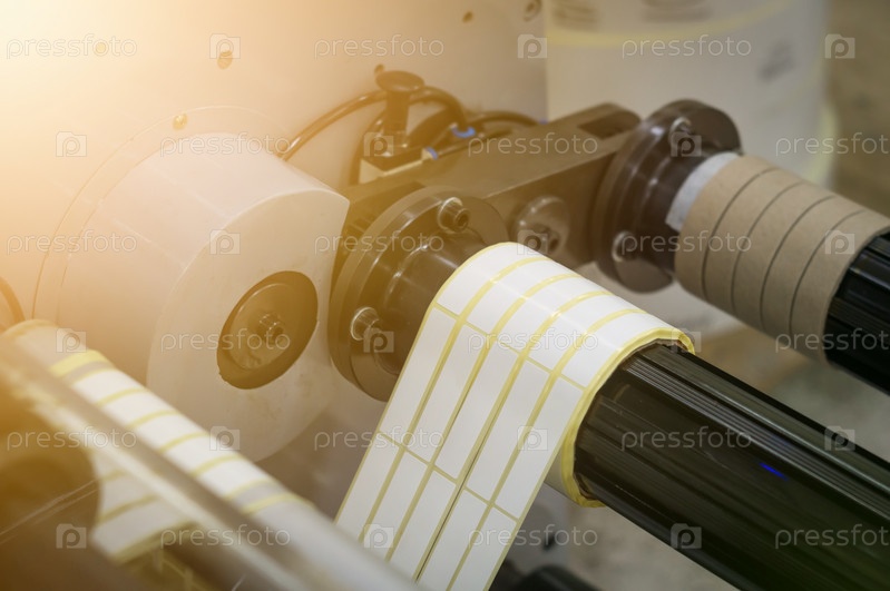 Машина для производства белых самоклеящихся этикеток. Валы машины для намотки рулонов ленты с этикеткой. Высечка и резка бумаги для производства этикеток. Выборочный фокус