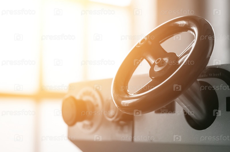 Машина с вращающимися ножами с круглым рулевым колесом для резки широкоформатной бумаги для типографии. Рукоятка управления на оборудовании. Крупный план части оборудования. Маховик. Выборочный фокус