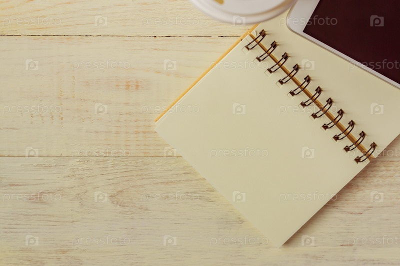 Ремесленная одноразовая бумажная кофейная чашка, блокнот и белый смартфон на деревянном фоне с копировальным пространством