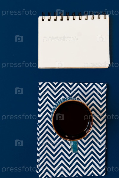 Вид сверху на чашку черного кофе и чистую тетрадь на синем фоне с копировальным пространством